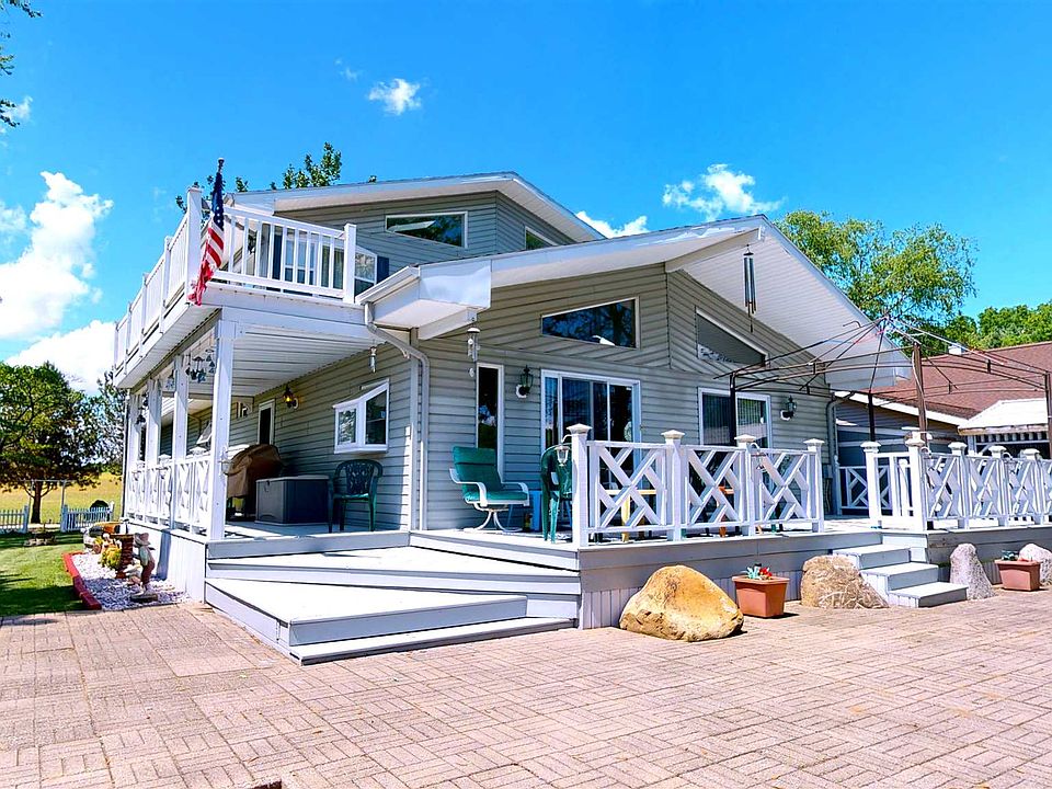 Welcome to this very bright and beautiful lake home. This home is located on a nice and quiet street. Very nice landscaped and very well maintained inside and out. This home features five very nice size bedrooms. One of the bedrooms is a very large master suite which is upstairs with an attached bathroom with a jetted soaking tub and a stand up shower. The other full bathroom upstairs has a jetted tub as well with a stand up shower along with 3 other bedrooms. This home has many windows and sky lights for amazing natural light. There is a large utility room and another full bathroom and bedroom on the main floor. The kitchen and dining room and living room are opened concept which is great for entertaining and staying close to the family while your cooking. There is sliding doors that leads outside to a gorgeous wrap around deck. There is 110' of water front. A summer house and gazebo. Plenty of storage space in the garages and sheds. All of this sits on .23 of an acre. Come see your dream lake home before it is gone!