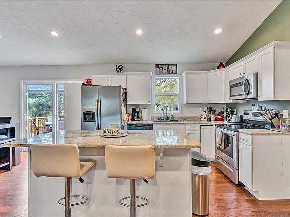 This beautiful home features 4 bedrooms, and 2 full baths. The great room, kitchen and breakfast area all open to each other and feature cathedral ceilings and mountain views from the eating area. Upper level features 3 bedrooms and a full bath. The lower level features a cozy family room with fireplace, the master bedroom and master bathroom. The basement level features a finished walk-in closet, the laundry area and lots of room for storage. Additional features include hardwood floors, granite, replacement windows, a deck, lower level patio, partially fenced yard, storage shed and an above ground pool with sand pump. Basement was waterproofed in 9/2018. According to the previous owner, the home was totally rebuilt from the foundation up in 2018.