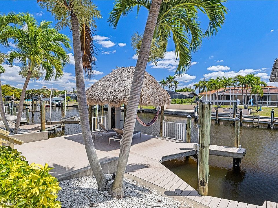 Key-West Style Home positioned with Direct Sailboat Gulf Access, just minutes to the open water, makes this location perfect for boaters. Also, the potential for Airbnb for this home comes turn-key, along with its prime location in the Yacht Club and the Downtown Cape Coral District. Amazing outdoor space includes a heated saltwater pool & spa to relax the day away, paver pool deck for outdoor dining, or relax under the Tiki-hut overlooking the water with an adult beverage. 10,000 lb. boat-lift w/canopy. Features a custom-designed kitchen with a propane gas stove-top, stainless steel appliances, walk-in pantry, granite counter-tops, bamboo flooring throughout, plantation shutters, and a security system. The primary suite provides a private retreat with access to outdoor living. The primary bathroom features a stand-alone soaking tub, dual sinks, and a large shower. Impact-resistant French doors & windows ensure safety and peace of mind. No water intrusion at all to this property!! It's time to come and enjoy the Florida Lifestyle!! Call for your private tour!!
