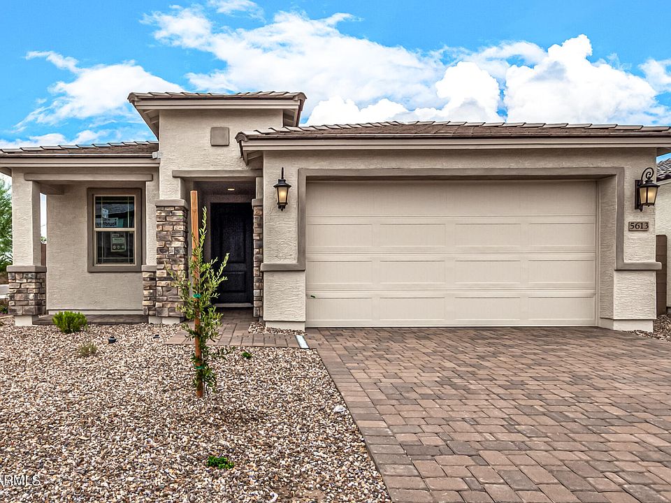 This exquisite one-story home showcases a flawless design, distinguished by its graceful lines. The Lily floor plan at Tierra Montana Discovery features three bedrooms and two baths, with an open layout and the owner suite thoughtfully tucked away at the rear for added privacy. The kitchen boasts upgraded 42-inch maple cabinets, quartz countertops, and a bespoke tile backsplash. Complete with GE Cafe stainless steel appliances, the eat-in kitchen seamlessly integrates a breakfast bar into the dining and gathering room.
