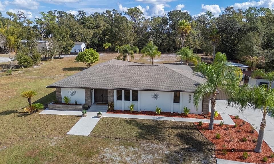 Welcome to 5614 Lazy Creek Dr, Lakeland, FL 33811 — a beautifully refreshed, move-in-ready home set on nearly 1.5 acres of peaceful, usable land in highly desirable South Lakeland. This rare property offers the perfect blend of modern updates, indoor/outdoor living, privacy, and convenience—all just 20 minutes from downtown. Step inside to discover a bright, open layout filled with fresh finishes, new tile and flooring, and beautifully updated bathrooms. The kitchen features brand-new cabinets, stainless steel appliances, and a spacious butler’s pantry ideal for storage and meal prep. Enjoy two versatile living spaces and a serene primary suite complete with a relaxing soaking tub—your own private retreat at home. Outside, the expansive acreage offers endless possibilities—garden, entertain, play, or simply unwind beneath mature trees. A newly finished screened-in porch overlooks the peaceful backyard, making it the perfect spot to enjoy the Florida breeze. For hobbyists or anyone needing extra space, this property truly shines. Highlights include: Brand-new 2025 workshop (400 sq ft) with two roll-up doors + pedestrian door,2-car side entry garage, multiple storage sheds, wide-open land with room to spread out and make it your own. Homes offering this much land, updating, and flexibility rarely come available in South Lakeland. Whether you need space for equipment, hobbies, a small business, or simply want room to breathe, this property checks all the boxes. Don’t miss this opportunity — schedule your private showing today or share this listing with your agent before it’s gone! **Click on the virtual tour button for a Matterport 360 degree immersive walkthrough tour of the home. Just like a 24/7 open house!