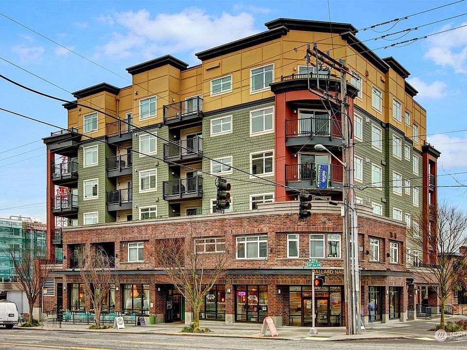 Exquisite 1Br/1Bath/den condo nestled in the heart of vibrant Ballard. Situated on TOP FLOOR of the Metropole Condominium, this premier residence offers coveted eastern exposure w/views of mountains, canal & surrounding territory from the roof top while enjoying evening sunset. The spacious floorplan boasts soaring ceilings, open concept living spaces & custom built-ins desk in an open den area & solid hardwood floors. Double sided gas fireplace to living room & bedroom warm the unit with private balcony for fresh air. Indulge your inner chef in this incredible kitchen with slab granite countertop, SS appliances and tons of cabinets to store your pots & pans. Walk-in closet, large full bath, parking spot on common garage & storage.