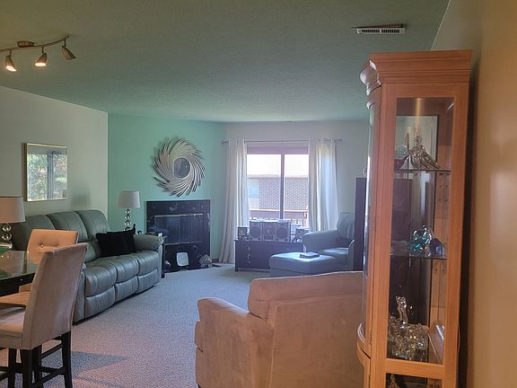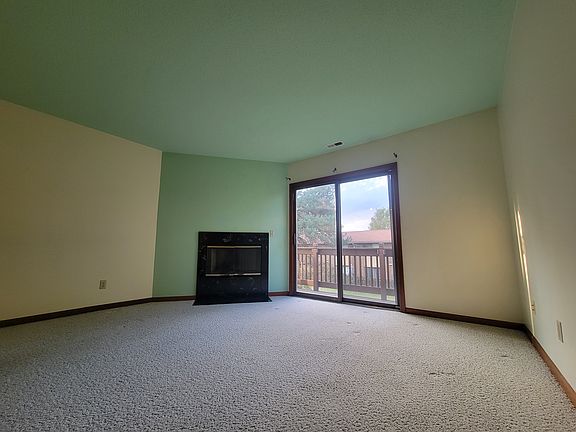 The condominium features a spacious living room with cozy fireplace and a sliding door leading to a private balcony perfect for relaxing and entertaining.