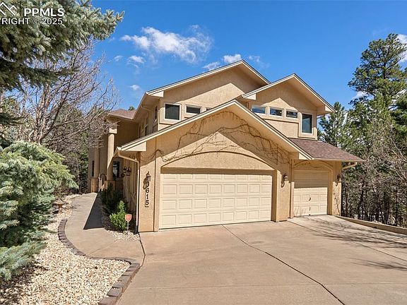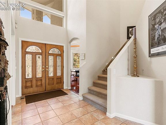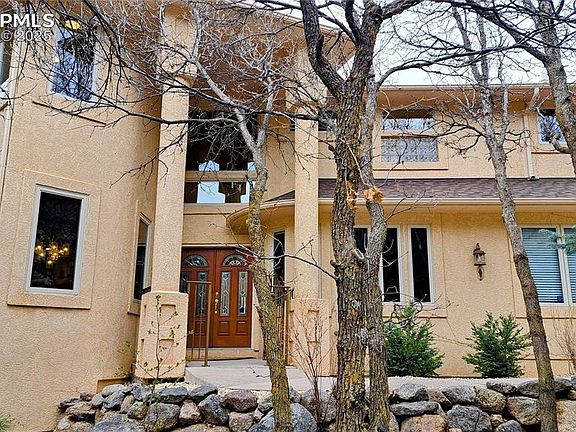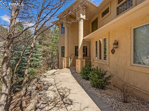 Experience elevated living in this light-filled, custom contemporary home, showcasing expansive mountain and city vistas through soaring walls of glass, located in award-winning school district 12. This architecturally distinctive residence offers four private suites, including a luxurious primary retreat, each with walk-in closets and spa-inspired jetted tub. Three baths feature dual vanities for added convenience and elegance. Designed for both grand entertaining and refined daily living, the home features four fireplaces, two formal dining rooms, a chef’s kitchen, potential three offices or flex spaces, a dramatic great room, a fitness studio, walking out to private outdoor terraces with mountain views. The open-concept layout centers around the gourmet kitchen, outfitted with leathered granite counter, custom cabinetry, and premium appliances, flowing effortlessly into the stunning great room anchored by a floor-to-ceiling stone fireplace and framed by sophisticated built-ins. The primary suite is a true sanctuary with sweeping city views, dual marble vanities, double closets, a Jacuzzi tub, and a spa-caliber steam shower with dual heads, all enhanced by a double-sided fireplace. An open loft overlooks the grandeur of the great room, while the secondary suites offer custom features like vaulted ceilings, dedicated study or play areas, and additional see-through fireplaces. A private study with inspiring mountain views, a recreation room connected to the home gym, and a second office with direct walk-out access to the backyard provide both functionality and retreat. Finishes include cherry hardwood flooring, extensive custom cabinetry, built-in audio with independent sound zones, central vac, dual furnaces, and A/C. Newer carpet & new wood flooring in laundry and baths. Set in a serene mountain setting with glittering city lights, just minutes to shopping, dining, and Fort Carson. This is a one-of-a-kind contemporary haven for the discerning luxury buyer.