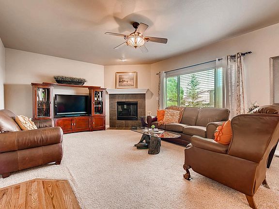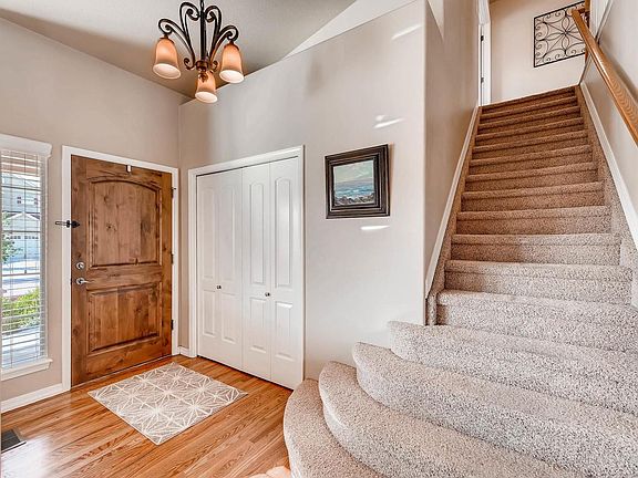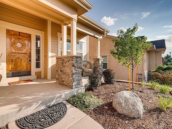 This Wolf Ranch home is amazing! Beautiful wood floors in kitchen and entry, open kitchen/ family room, cherry cabinets in kitchen with granite counters, gas stove and stainless steel appliances! Kitchen walks out to incredible large deck with view of the mountains and the sound of the back yard water feature! You are going to want to hang out all summer! Upstairs provides three large bedrooms and office/loft! Private master suite has 5 piece bath, upgraded fixtures and huge closet! Two more large bedrooms upstairs! The large basement has room for entertaining and custom wet bar with dishwasher! Another large bedroom, 3/4 bath and lots of storage! Finished garage and beautiful landscaping front and back! This home has been lovingly maintained! Come and see!