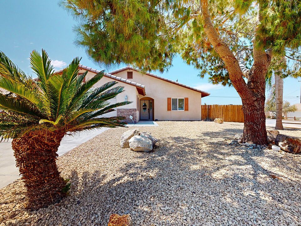 Welcome to this charming 3-bedroom, 2-bathroom home in the desirable Chocolate Drop area of 29 Palms. Nestled on a spacious quarter-acre corner lot, this property offers comfort, privacy, and convenience. The kitchen features a large U-shaped breakfast bar, perfect for serving quick meals on the go. Stainless steel appliances and ample cabinetry make it ideal for everyday cooking and entertaining. The master suite is designed for ease and relaxation, with dual walk-in closets, a powder area, and a dual vanity that makes getting ready in the morning a breeze. Private access to the backyard adds an extra touch of convenience. The guest wing offers two additional bedrooms, each with ceiling fans and ample closet space. The guest bathroom features dual sinks and a tub/shower combo. The fully fenced backyard features a covered patio perfect for outdoor dining or lounging. Additional features include recent flooring upgrades, central heating and cooling, a dedicated laundry room, and proximity to local shops, restaurants, and Joshua Tree National Park. Schedule a showing today!