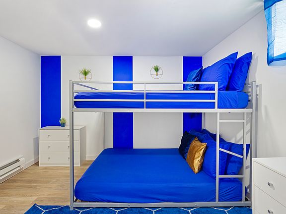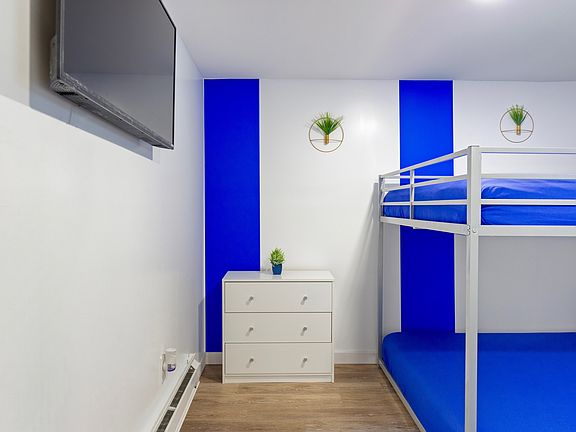 Private bedroom with a full over full bunk bed, dresser, smart TV, and Closet, located in the basement unit of a well-kept triplex. The unit features its own private kitchen, living room, bathroom, and laundry area, offering a fully independent living space. Comfortable and quiet environment, ideal for long-term stays.