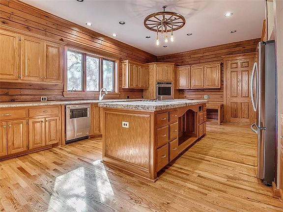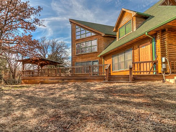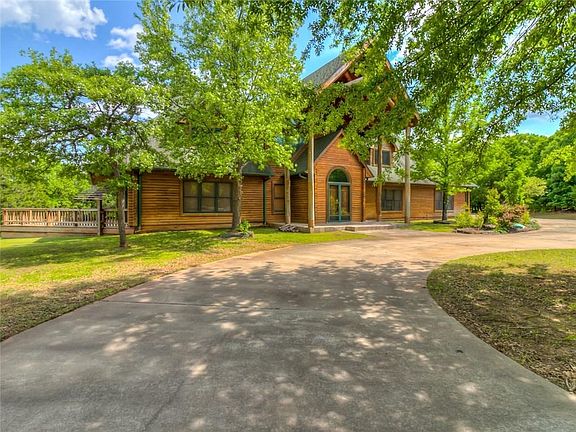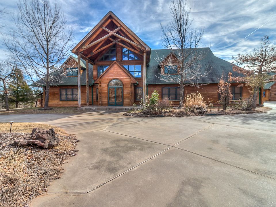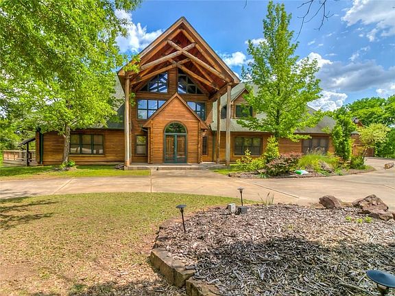 A unicorn has been spotted! Your chance to own a Colorado-style log cabin/lodge on 2.5 acres in Edmond. A spiral staircase and suspended catwalk divide the 54x24 great room which is highlighted by a 33-ft wood-beam ceiling, amazing windows, and matchless woodwork. Step outside and take in the view from your nearly 2,000 sq ft deck and gazebo which awaits your hot tub, pool, or sport court amidst the trees and trails. The chef's kitchen features all new stainless appliances to include double ovens, refrigerator, dishwasher, microwave, and ice maker, in addition to a 9-ft center island, granite counters, and cabinet space galore! Looking for garage/shop space? How about a 3-car attached garage and TWO shops?!! Wood floors throughout the main floor connect a library with rolling bookcase ladder, formal dining that accommodates 20 people, and the main living room which opens to the kitchen. Bedrooms are huge! With a little work, this will be a $1M+ 'vacation from home' property.