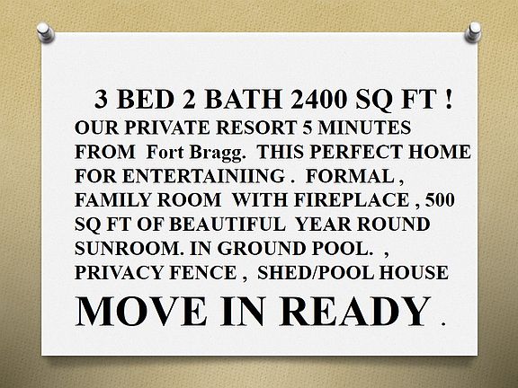 Wow!! Just minutes away from Ft. Bragg, shopping, restaurants, this 3 bedroom, 2 bathroom, just over 2600 sq ft home, is an absolute beauty with its many upgrades, to include, black stainless steel appliances, granite countertops, LVP flooring, tiled bathrooms, painted fireplace w/mantel, updated light fixtures, 2018 roof, and so much more, you'll have to come see for yourself. The spacious sunroom in the back of the house features a wet bar w/dishwasher, and overlooks your own private oasis of a backyard! The inground pool is ready for you to take a plunge in, surrounded by mature palm trees, a large patio and deck area, with outdoor shower, and privacy fence that encloses the whole back yard. The finished pool house is pretty fantastic with electricity, ceiling fans, new windows, LVP flooring downstairs, and carpet upstairs. Come see this hidden gem today!