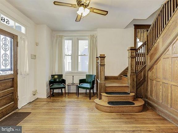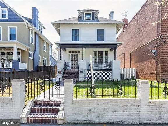 Classic American Foursquare w front porch, BACKYARD patio and 2nd floor terr. 4 spacious bedrooms, 2 full baths and 2 half baths ON main floor AND BASEMENT, formal CLASSIC foyer, high ceilings, living dining rm, original hardwood floors. Finished basement w laundry, space for office or rec room. Standing-height loft attic with full bathroom. Home has great potential in well sought neighborhood