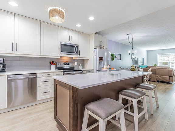 Stunning main-level condo with private balcony showcasing gorgeous lake view. Elegant open floor plan, featuring luxury vinyl plank flooring in main living areas. Rare find in this location and a true must see. Kitchen was remodeled in 2022 and features luxurious cabinets, quartz counter tops, subway tile backsplash, pendant lighting over the oversized center island, stainless sink with goose neck facet, all appliances included and bonus is the pantry closet. Living room you will quickly notice the gas fireplace with stone surround and freshly painted mantel. All interior trim, walls, inside and outside of closets freshly painted in 2023. Primary suite offers cozy carpet, ceiling fan, walk-in closet and primary bath featuring double vanity, standing shower with sliding glass doors, deep linen closet and tile flooring. Spare bedroom down the hall is ample in size and also features same carpeting with decent size closet. Guest bath is the only room that has not been painted but you will love the wall design featuring black and white wall paper, gold features which gives this room a touch of class. In 2023 all the windows in home where replaced with energy effect windows, HVAC serviced by Bracket in fall and spring, new hardwired smoke detectors professionally installed last year, custom blinds made in 2023, raised toilets added in 2023, disposal new in 2023, new ceiling fan added to balcony last year, fireplaces serviced and cleaned by Bassemiers 2023, large deep garage approximately 15 x 39( room for 4 cars ), dining light fixture updated last year, encasement blinds in balcony entrance door and 1 year home warranty included. Sellers are currently on budget billing paying $144 a month. HOA is $325 a month includes: water, trash, maintenance of common areas, snow removal, accounting, pest control and more. You will love the surrounding trees and atmosphere condo offers, close to all the conveniences, yet feel’s like a vacation get away.