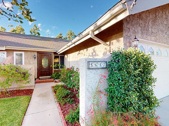 Nestled in Camarillo's coveted Mission Oaks, this move-in-ready, single-story Spanish-style gem blends elegance with seamless indoor/outdoor living. Lush landscaping and a newly stained wood door with beveled glass welcome you inside, where polished terracotta floors lead to a bright living room and formal dining area with high ceilings. The cozy family room, featuring custom built-ins and a wood-burning fireplace, invites relaxation. A remodeled gourmet kitchen shines with refinished cabinetry, granite countertops, a new garbage disposal, and stainless-steel appliances. The private primary suite, tucked in its own wing, offers his-and-her closets, high ceilings with a ceiling fan, French doors to the backyard, and a luxurious en-suite with a spa-like shower, granite vanity, high-end fixtures and tile and marble finishes. Two spacious bedrooms sit near a remodeled hall bathroom with a custom granite vanity and tub/shower combo also complete with high-end fixtures, tile and marble finishes. A French slider opens to a stunning backyard with lush landscaping, a stamped concrete patio, a pet-friendly fenced yard, and a retaining wall holding up nice hillside planted with mature fruit trees and ensuring privacy. Meticulously maintained for nearly 25 years, this home boasts a tankless water heater, whole-house water softener, Milgard dual-pane windows, plantation shutters, and copper plumbing. A detached 16x12 office/hobby room offers future ADU potential. A two-car garage with automatic roll-up door, large driveway, and side yard provide ample parking. Located in the acclaimed Pleasant Valley School District, near Mission Oaks Dog & Play Park, Roxy Movie Theater, and shopping, this home offers an ideal lifestyle. Don't miss this rare gem in Camarillo's premier neighborhood. Please schedule your tour today before it's gone!
