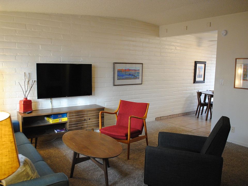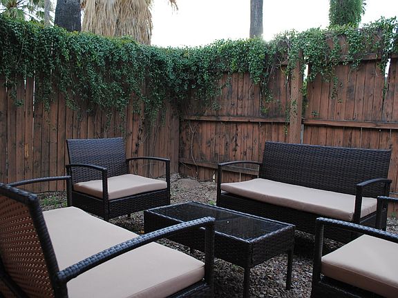 Furnished and stocked, 2 or 3 Beds, 1 Bath, patio apartment near Glenn and Craycroft. $1950 per month. Utilities included! TMC and Fort Lowell park are just across the streets, close to shopping and schools (Whitmore, Dodge Magnet, Catalina High Magnet, Basis North), and "The Loop"/Pantano wash Path. Deluxe carpeting, gas furnace with central AC. Enclosed front and back yards, covered designated parking, extra street parking for additional car(s). Includes: Washer/dryer, Fridge, Stove, Microwave, Dishwasher, Disposal, Ceiling Fans, and Window Coverings. Large Closets and lots of Storage! Fully furnished and stocked with bedding, towels, and kitchen gear, gas grill and out door furniture Bedrooms each include TV, dresser, bedside table(s) lamps, closet(s). Master has the option of two twin beds or one King. Other Bedroom has Queen. Living room has couch, recliner, side chair, coffee table, credenza, 50" tv and artwork throughout. Eat-in kitchen with table and 4 chairs. Great for Healthcare workers/family members at TMC, divorcees, single parents, relocation, temporary workers, 1-2 adults + 1-2 kids. Month to Month, full months preferred. NO PETS. NO TOBACCO/MARIJUANA SMOKING. Utilities and wifi included. No application Fee! Available NOW! Cleaning fee. Information deemed to be accurate but not guaranteed. Utilities, AC and wifi included, No Tobacco/marijuana Smoking, no pets.