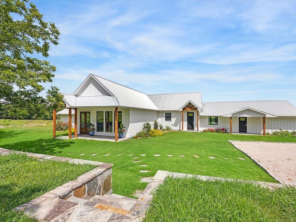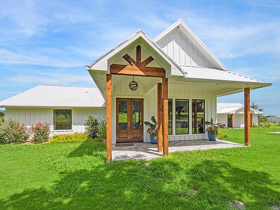 Welcome to Round Top! The perfect getaway or suitable for full time living. This house was beautifully remodeled in 2022 and sits on a scenic 4 acres in Round Top. Enjoy the country setting down a quiet road and surrounded by a pasture of cattle. The main house boasts beamed, vaulted ceilings in the spacious living room and large windows throughout that welcomes natural light and great views. The chef's kitchen is ideal for entertaining with a butler's pantry and easy access to the back porch. The striking blue and natural wood cabinets will be a talking point along with the brushed bronze accented appliances. In the main house, there are three bedrooms and two and a half baths with extensive tile work. The property also features guest quarters which includes a full kitchen, living area, two bedrooms, a bathroom, and a nook for a washer and dryer - great for guests or income producing rental!