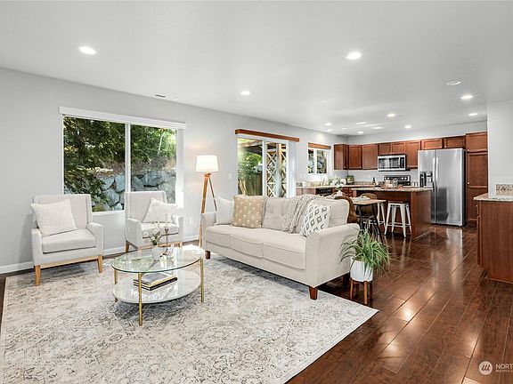 Nestled in the popular Skagit Highlands, this spacious and versatile two-story home offers a charming front porch entry leading to an open floor plan. The generous kitchen area boasts ample storage cabinetry and a center island with seating, seamlessly flowing to the outdoor patio, pergola, and backyard framed by boulders. The primary suite features a walk-in closet and a spacious bathroom with a soaking tub, tile and glass shower, and dual sinks. Three additional bedrooms and a generous landing area offer potential for a workspace, play zone, or media area. The property includes an attached 2-car garage and driveway parking. Enjoy Skagit Creek Park across the street, with mountain views and nearby trails. This home awaits your presence!