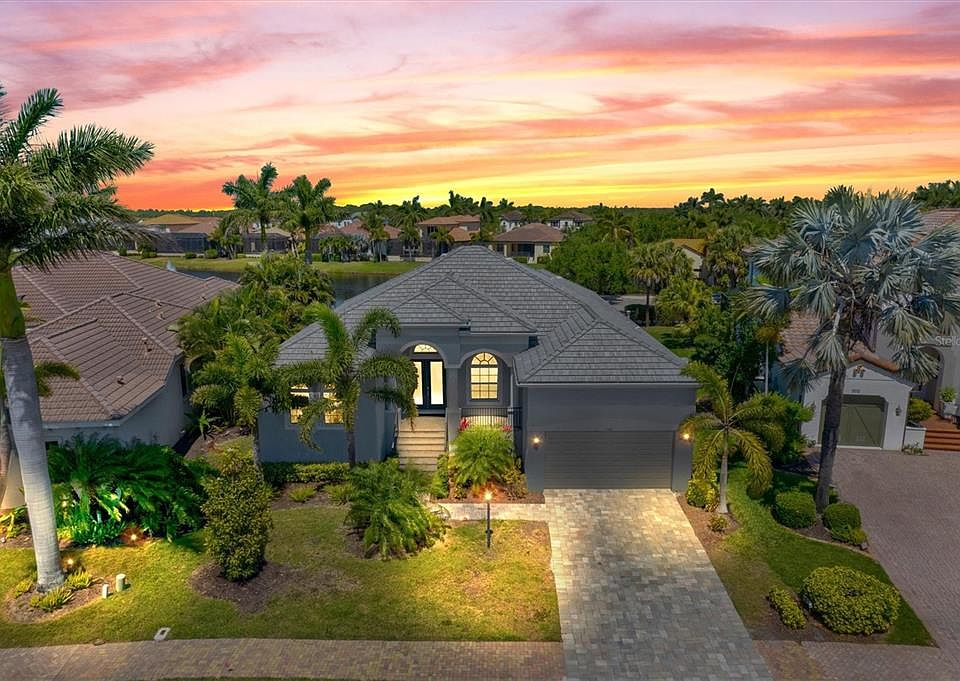 One or more photo(s) has been virtually staged. This is your chance to live in gorgeous, highly sought after Legends Bay! The gated community features amenities such as a clubhouse, a pool, and a community boardwalk overlooking the Sarasota Bay. Your own piece of paradise awaits on Inspiration Terrace - a three bedroom, three bathroom home with an open floor plan drenched in natural light. Enter through the gorgeous front porch or through the epoxy floor two-car garage into a spacious main area with living, dining, and a kitchen. The kitchen is a chef's dream, with a large island, white cabinets, granite countertops, a gas cooktop, a double oven, vent hood, stainless appliances, and a pantry. Find tray ceilings in the living area, and farther back, sliders lead to a paved lanai and a heated saltwater pool, overlooking a lovely pond. Relax after a long day in the additional den or great room, and sleep tight in any of the three bedrooms. The master suite features his & her walk-in closets and a spacious bathroom with dual vanities and a separate, tiled tub and shower. Stay cool and dry in the summer heat with ceiling fans and tiled floors throughout the home. Laundry is a breeze thanks to the dedicated laundry room. Located just 6.5 miles from Florida’s top-rated gulf beaches, this golf cart friendly community is a short ride to IMG Golf and Country Club offering an 18-hole championship golf course, and you're just minutes from IMG Academies! Conveniently located near the SRQ International Airport, Downtown Bradenton Riverwalk, and Downtown Sarasota with fine dining, entertainment and cultural venues, one-of-a-kind shopping, and more. Act fast - this opportunity won't be around for long!