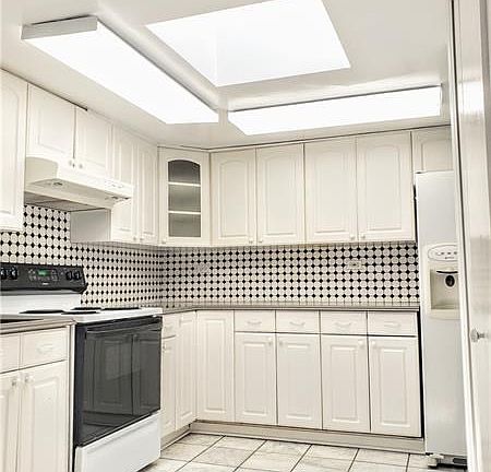 Large top floor end unit! Freshly painted grey walls with bright white trim. The kitchen skylights allow light to pour over every inch of this light and bright kitchen. Complete with BIG pantry, marble floors and updated back splash its just waiting for you to make it yours. The area beside the kitchen is equipped to be a laundry area BUT can also be used as a breakfast nook. Entertaining is made easy with a dining area living room combo just off the kitchen. If you are in need of a bit of fresh air, take a step onto your private balcony with a breathtaking view of the neighbors garden. There are two large bedrooms with the main bedroom offering a full bath and walk in closet. Coin Laundry available in the building, Storage area in the garage. CLOSE TO EVERYTHING!