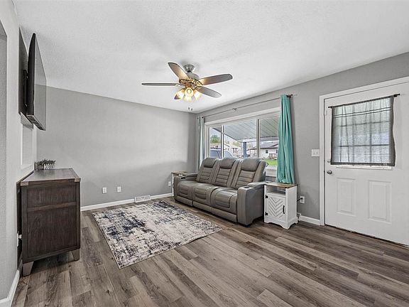 Charming updated 3-bed, 1-bath home with fresh paint and newer LVP flooring throughout main living areas. Enjoy the bright living room and modern eat-in kitchen, featuring new cabinets, countertops, stainless steel appliances, and stylish backsplash. The updated bathroom features a new vanity and toilet. Heated breezeway offers space for a home office and a convenient laundry area. Relax outdoors with a covered patio and newly expanded patio space-enjoy a large, fenced backyard with a storage shed, an oversized one-stall attached garage, and an extended driveway for extra parking. New siding, newer windows, and all appliances included- just move in and enjoy!