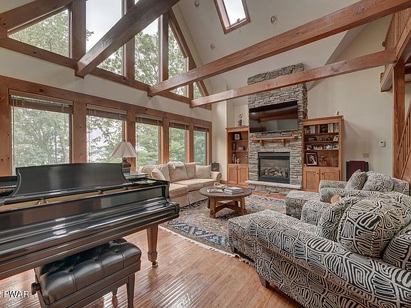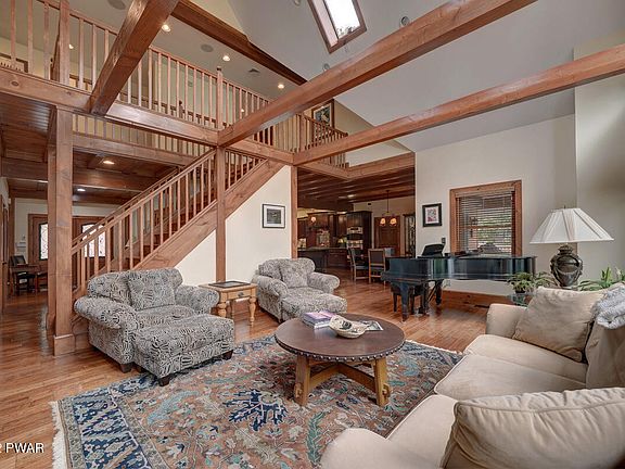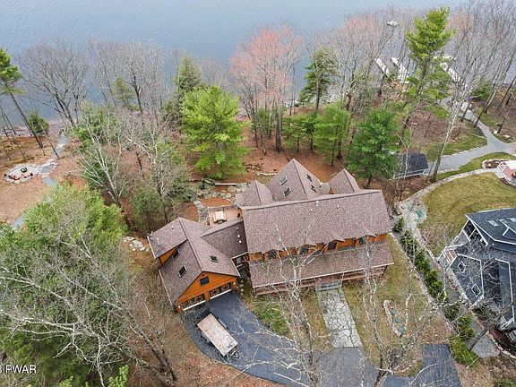 Lake Wallenpaupack Lakefront Home with unique guest cottage! This three story home, complete with an elevator offers 5 bedrooms plus loft, office and spacious unfinished room above garage, 5.5 baths, open & flowing floor plan, living room w/ floor to ceiling stone fireplace & cathedral ceilings, modern kitchen with huge island, dining area, mud room, covered & uncovered decking and more! Full finished, walk-out lower level with theatre, family room and storage rooms! Lakeside hot tub on patio, lakeside fire pit and a gentle path to 138' of level Wallenpaupack lake frontage. Paved driveway, attached 2 car garage plus detached garage. Whole house generator too! The original cabin still remains on property & could be updated to be an incredible guest house!, Beds Description: Primary1st, Beds Description: 2+BED 2nd, Baths: 1 Bath Level L, Baths: 2 Bath Lev 1, Baths: 2 Bath Lev 2, Eating Area: Dining Area, Eating Area: Modern KT, Beds Description: 1BedLL
