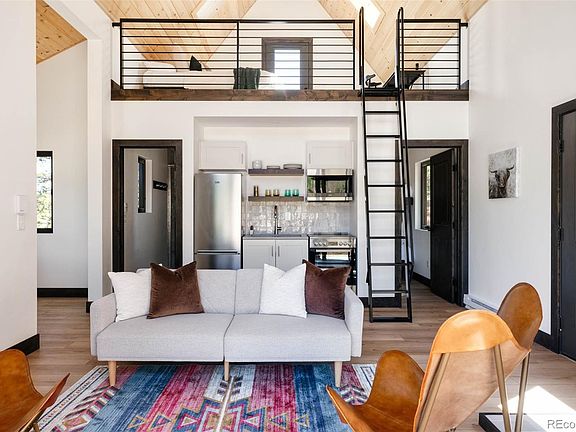 This newly constructed A-frame-esque home in Bailey, Colorado, offers the perfect blend of modern comfort surrounded by stunning natural beauty. Immerse yourself in the breathtaking panoramic views of the Rocky Mountains from just about every room in the house including the thoughtfully constructed trex-deck patio. Inside, you'll find high-end finishes with beautiful tile selections and gleaming luxury plank vinyl floors providing lasting durability. The vaulted tongue and groove ceilings create a sense of spaciousness and warmth while floor-to-ceiling windows invite an abundance of natural light, allowing you to fully appreciate the surrounding beauty from the comfort of your home.This charming mountain home features two cozy bedrooms, providing ample space for both family and guests. The living room features a wood burning stove and a center meet sliding door that overlooks the Rockies and opens onto the front patio. Just off the kitchen and living room you’ll locate the dining room centered around a globe ratan chandelier. On the main floor you’ll find the first bedroom equipped with built in bunk beds, storage shelving and the washer / dryer hookup. Step up the ladder or head around back to the staircase to discover the spacious loft style second bedroom, showcasing more stunning mountain views. Conveniently located just 55 minutes from Denver, you can enjoy the city's amenities while still savoring the tranquility of mountain living. A short 15-minute drive will take you to the highway, offering convenient access to a multitude of surrounding activities. For entertainment and dining options, Bailey Main Street and Mad Jack Brewery are a mere 20 minutes away. Nature enthusiasts will love the proximity to the scenic Guanella Pass, only 40 minutes away, and the picturesque Kenosha Pass, just a 30-minute drive. Don't miss your chance to make this mountain sanctuary your own while staying conveniently connected to Denver and the surrounding attractions