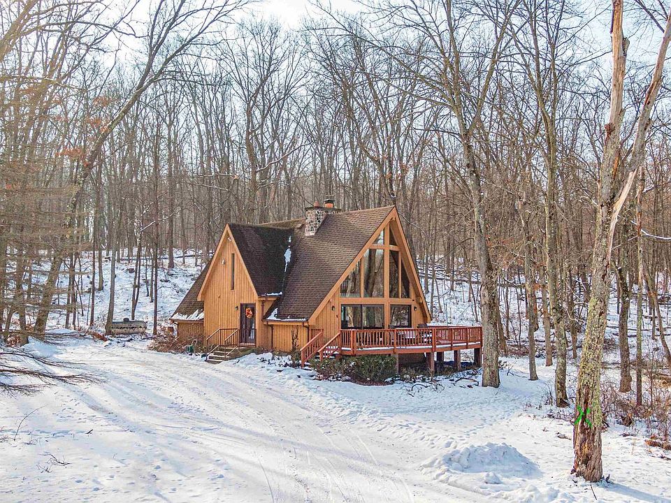 Tranquility, privacy, and nature on 18.98 acres of mature hardwoods only 6 miles from downtown Dells with rolling hills and a spectacular pond. The main home has lots of space for gatherings in front of a field stone fireplace and under vaulted ceilings. Enjoy an evening on a large deck overlooking the pond. A 2-car garage has living space that could be used for guests or a rental. Many animals including deer, turkeys, heron, turtles, and cranes. A nature lovers paradise. In winter enjoy ice skating, hockey, or fishing on the pond. Snowmobile trails a minute away. Property is currently being used as a short-term rental.
