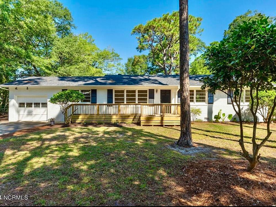 This Long Leaf Acres gem has been renovated for YOU! Perfectly located between Wrightsville Beach, Mayfaire, Biggers Market, and Downtown Wilmington, is a fabulous 4BR/2BA ranch chalet on a giant 0.48 acre lot with lovely landscaping and mature plantings. This 1966 beauty has met 2024 with style. Stunning, modern white kitchen with brand new SS appliances, Carrera quartz countertops, ceiling-height wood cabinets, deep basin sink, gold fixtures and hardware! All-new gleaming bathrooms with modern fluted-detail vanities, gold fixtures and marble-look tile. Double glass French-door BR could be used as a home office! Exquisite refinished hardwood flooring, LVP, and tile throughout. One-car garage and separate laundry room/storage. Lovely entry wooden walkway and porch. Brand NEW roof, NEW HVAC ductwork, much NEW plumbing! Double sliding glass doors off of the large living room open to enormous outdoor living with hardscape space, storage shed. Room for a pool, or additional dwelling unit! Fresh, gorgeous, modern paint inside and out. Fully fenced backyard. No HOA! So, so beautiful! Welcome Home!!!
