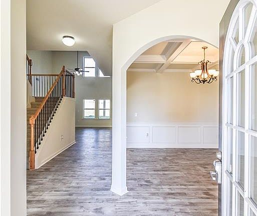 This gorgeous home will not last! You will be wowed with the bright open feel with oodles of natural light coming from cathedral ceilings in the living room. Large formal dining area with coffered ceilings. Luxury Vinyl Flooring! Master on the first level! Beautiful kitchen with tons of cabinet space and granite countertops. Eat in area facing the backyard space with covered patio and fully fenced yard. Flex room to use as you choose and half-bath complete main level. Head upstairs to find 3 more bedrooms, one with its own full bath and a jack-and-jill between the other 2. All have vaulted ceilings. Community pool, clubhouse, and fitness center