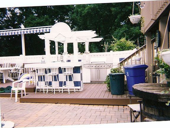 beautiful maintenance free backyard. pond, decking, hot tub, day bed custom bar with built in barbaque. 40 foot awning covering 40 foot deck
