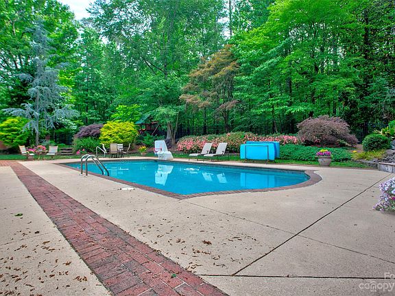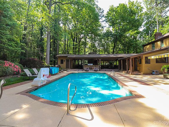 with its living room, wood f/p, kitchen, overlooks a large inground pool, beautiful flower