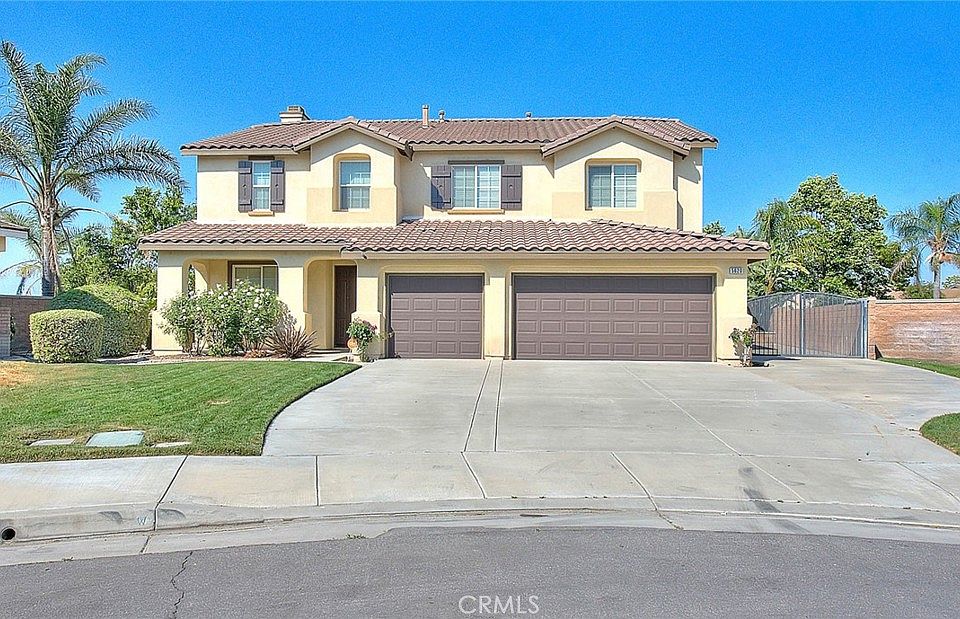 Welcome to this stunning 5 bedroom and loft home with 3 bathrooms on a third of an acre! Eastvale offers a great lifestyle with affordability! You will be hard pressed to find a larger lot in the community, and one that is fully landscaped with amenities which are not often offered. Enjoy the lighted sport court, gazebo, covered patio, gated RV parking- all on a quiet cul de sac. What a super floor plan with one bedroom and bathroom downstairs. This is an original owner home and well maintained as you would expect. The covered front porch opens to a tiled foyer and living room/dining combo. The kitchen is open to the spacious family room w/fireplace. A sliding door goes to the back yard where outdoor living awaits! Upstairs are 4 bedrooms and a giant loft! The loft can double as a second family room, use your imagination. The primary bedroom boasts a private balcony with views to snowcapped mountains. There is a sitting area and a luxury bathroom with twin vanities, a separate tub and shower, and a large walk-in closet. The back yard features all block walls and a pre plumbed pad for a spa. Schools are sought after and award winning. Many local parks and nearby excellent shopping. Come visit and fall in love!