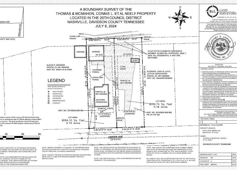 This transaction is for 5618 and 5620 Obrien Ave each lot is a 50x161 with alley access both lots are approved for 2 HPR'S, there is a house there that needs to be tore down ''''''' DO Not Enter The House'''''''' Great building location , min to downtown Nashville and Green Hills. Buyers and buyers agent to verify all information to be accurate. The tax records do not reflect the new dimensions of the lots. A copy of the new survey is in the photos. Do Not enter the home. Property sold AS-IS