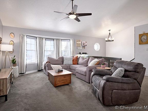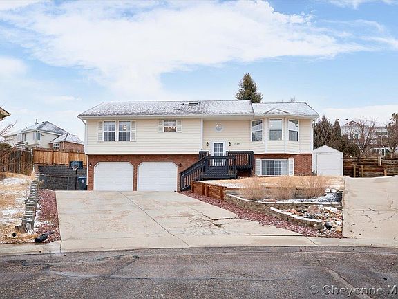 Sunny, spacious and updated, this Crest Ridge gem is situated on a South-facing lot at the end of a cul-de-sac! Enjoy serene views of Cheyenne with a backdrop of majestic mountains. Two of the four large bedrooms have attached en-suites making this home ideal for family, guests, roommates, and home office needs. Updated lighting, flooring, quartz countertops, kitchen backsplash, fixtures, central AC, and sprinkler system! Walk-in closet, two family rooms, oversized attached garage and extra parking.