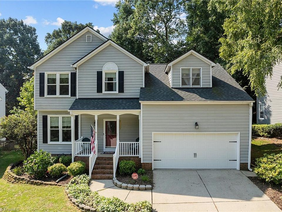 Open House Cancelled **Under Contract**Charming "Adams Farm" beauty that is a show stopper! New Roof 2022! As you drive up, your eyes are immediately drawn to the fabulous southern-style front porch. Step into the welcoming foyer, which opens up to living and dining areas, both featuring sparkling wood floors that add a touch of sophistication. The kitchen is a delight, with stunning granite countertops and a seamless flow into the cozy den, where you'll find soaring ceilings and a fireplace with gas logs—perfect for gathering on cooler evenings. Upstairs, the primary suite is a retreat, complete with bath featuring a separate shower and soaking tub. Down the hall, you'll discover two additional bedrooms and an oversized bonus room that offers endless possibilities. Outside, the backyard is your private oasis, boasting a beautiful tree line, a spacious deck, and a fenced area ideal for relaxation and outdoor fun. This home is perfectly located, close to everything you need.