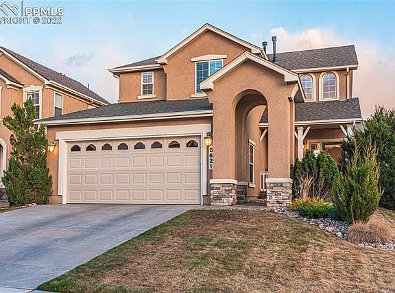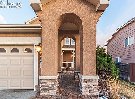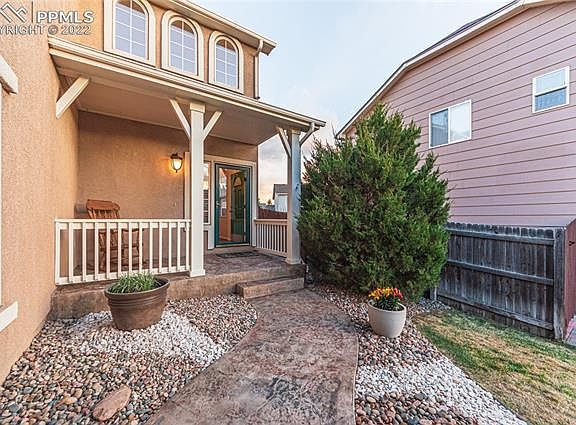 Put this one on the top of your list! This 2-story home with finished basement welcomes you as you pull in the driveway. Conveniently located in the Wagon Trails Community it is close to shopping centers and within walking distance to a Community Pool, Parks, Freedom Elementary School, and easy access to Powers Blvd or Woodmen Rd. The covered front entry opens naturally into the the great room with towering 9' ceilings, gas fireplace, built-ins, with gorgeous natural lighting from the windows. This home is perfect for entertaining friends & family. The great room connects you with the upgraded kitchen & dining space. With an oversized granite island and stainless appliances, the kitchen is a cooks dream. From the adjoining dining space you can walk-out to the backyard with the deck and powered patio ready for a BBQ and hot tub. Heading upstairs is host to the primary suite, dual closets & 4pc bath w/private commode. The additional upper level bedrooms have access to jack-n-jill full bath w/dual vanity, newer light fixtures & hardware. Head downstairs to the finished basement with a large family room boasting a wet bar, light & bright 4th bedroom, & bath. Additional highlights include: New Furnace 2022, New Air Conditioner and Condenser 2022, newer back sliding door 2019, Custom blinds on the main and upper level, Updated bathrooms 2021, Oil Bronze hardware throughout, Stucco exterior, all perfectly landscaped to be YOUR Colorado home.