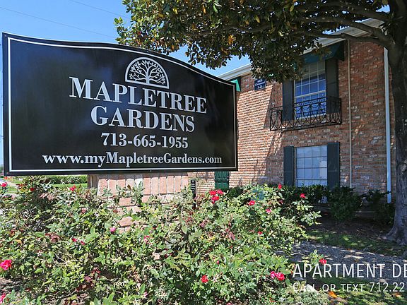 REF: # H2883. Refer this number when you reaching us about this AD. Description: Mapletree Gardens is a garden style apartment community located in southwest Houston only 3 miles from the renowned Galleria Area. Offering 1 and 2 bedroom apartments as well as Townhouse style units, we pride ourselves in making your home a place where you can afford to dwell well. Courteous and professional staff, 24 hr emergency response, recent renovations, covered parking and great prices only to name a few of the amenities our community has to offer. With easy access to I-69 and the 610 loop youall be closer than ever to shopping, dining, HISD Schools, and more. Come visit and see for yourself. Cats Allowed: one time fee: $150 Dogs Allowed: one time fee: $150 Lease Options: 13/9 months: Other Fees: admin fee: $75, application fee: $45 Property Information: built in 1973: , 497 units/2 stories: Apartment Features: High Speed Internet Access, Air Conditioning, Heating, Ceiling Fans, Smoke Free, Cable Ready, Tub/Shower, Disposal, Kitchen, Oven, Range, Refrigerator, Walk-In Closets Community Amenities: Laundry Facilities, Controlled Access, 24 Hour Availability, Planned Social Activities, Business Center, Playground, Gated, Fenced Lot, Courtyard, Picnic Area