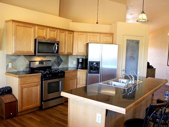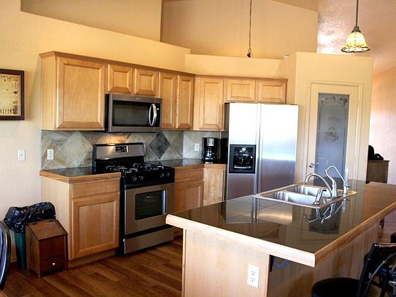 Gorgeous 3 bedroom/2 bathroom stucco home with a 2 car attached garage. Kitchen features island breakfast bar with sink, tiled black splash, pantry, pendant lights and stainless steel appliances. Adjoining dining area with walk-out to back yard. Open floor plan. Living room features vaulted ceiling an gas fireplace. Master bedroom includes vaulted ceiling, adjoining master bathroom with jetted tub, walk-in shower and double sink vanity. Spacious bedrooms with newer carpet. Fountain niche. Large closets, paneled doors, Shed is included. Great views and plenty of elbow room on your 5 acre parcel.