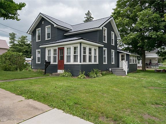 Come check out this beautiful village home with several upgrades. Owners have put new vinyl siding and steel roof on home. There's trex decking at the front entrance and new flooring in the updated kitchen and dining room. The furnace, fireplace in the living room and the hot water have all been converted to natural gas. The home features an updated kitchen, dining room, large living room with fireplace, full bath and enclosed front porch on the first level. Second level has three bedrooms and a large closet.
