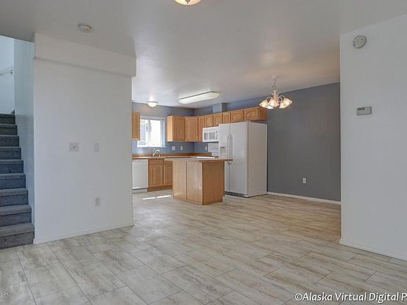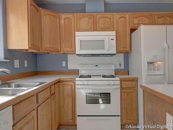 Stylish & spacioius townhome w/ an open living area, private yard, garage & tons of storage. Main floor living w/ all bedrooms upstairs & family room on lower level. All levels have their own bathrooms. Lots of room for the price! & Very low dues. So close to JBER & main roads. Listing agent is owner.