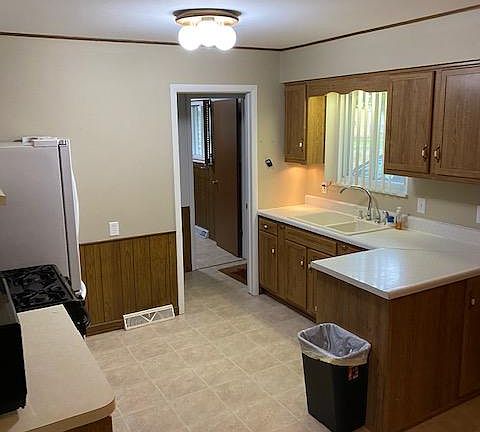 Three Bedroom, One and half bathroom brick home with detached garage and partially fenced yard in quiet neighborhood available for rent. Also has washer and dryer (electric) hookups. One dog or one cat okay (with pet deposit). Must have at least 600 credit score. First month and security deposited required (pet deposit if applicable) at lease signing (one year). Please use the phone number listed to schedule a walk-through and fill out an application. The renter is responsible for all utilities including water and maintaining the lawn.