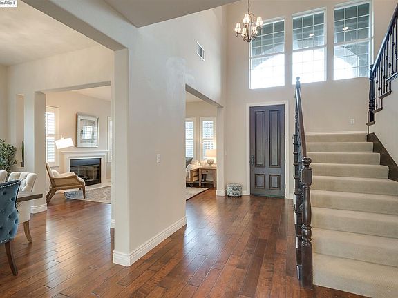View! View! View! This gorgeous executive single family residence is situated on premium lot by a trail and open space, also within walking distance to park and award winning Dougherty Valley High school. Opens up 2-story high ceiling foyer, solid hardwood floor throughout! One bed and one full bathroom downstairs, two laundry rooms, one upstairs and one downstairs, perfect for in-law or visitors. South-facing backyard & kitchen brings lots of natural bright lights in day time(North in the front). Upgraded gourmet kitchen,cabinets, walk-in pantry, granite countertop slab and full backsplash in artistic ceramic tiles. GE Profile stainless appliances, built-in refrigerator & microwave, 5 burner cooktop, double oven. Dual pane windows with plantation shutters, Iron stair railings, non-salt based water softener installed, productive fruit trees (lemon, peach, cherry, grape, orange, tangerine) and beautiful view in the backyard. Minutes drive to shopping centers, schools and 680 freeway!