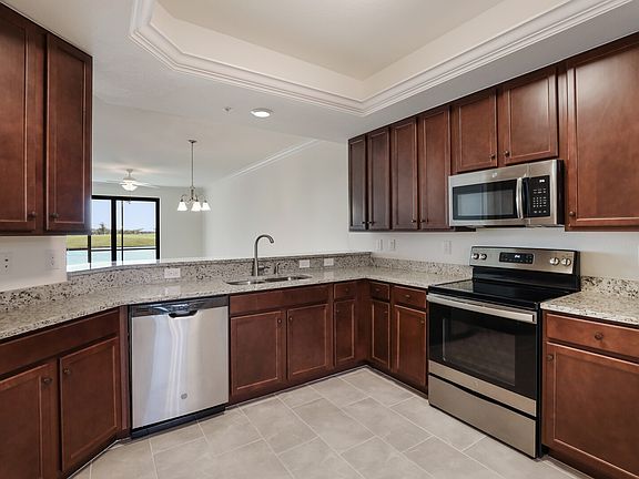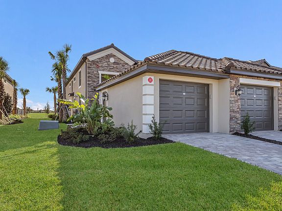 First floor Veranda IV condo is a corner unit on a street with only 4 buildings and 12 units per building; the building consists of 2 floors. The "Arabella'' provides an open floor plan of 1569 SF with the living areas to the rear of the condo allowing for maximal sunlight and enjoyment of the fabulous water views as well as views of holes 1 and 9 of the highly rated Arnold Palmer designed golf course. Access from screened / pavered lanai. One car garage with plenty of storage. Arabella brand new condo, never occupied, move in ready; corner ground floor unit. Study could double as 3rd bedroom; tile flooring; granite countertops; stainless appliances. Resort style, highly sought after, neighborhood with beautiful community pool; Clubhouse; Tiki Bar; Gym; Gated community