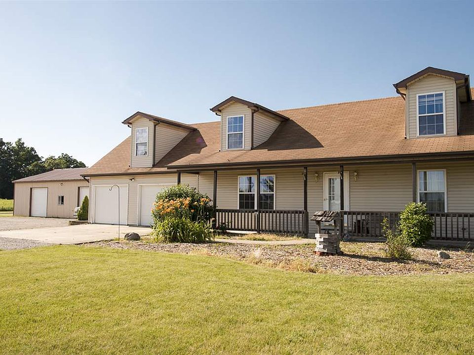Large, 2900s/f Cape Cod with 4 bedrooms and 3 FULL baths on 15 ACRES. Kitchen is open to the dining area and overlooks the beautiful views of the country side. Custom Oak Cabinets and ceramic flooring. All appliances stay with the home. Main floor master w/ a newly remodeled bathroom that has custom ceramic tile throughout and including the stand up shower. Great size family room on the main floor with a very large, 28x18 recreation room above the garage. Custom built in oak cabinets line one wall. This Rural country side beauty has a 2 1/2 car attached garage, 60x40 and 56x32 out buildings. Separate septic for rear outbuilding. Oversized deck off of the dining area has plenty of space to entertain. Room for grill, tables and plenty of chairs. This property would be great for a business with tons of storage for all of your toys. Imagine the possibilities.