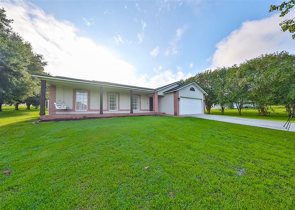 PRICE IMPROVEMENT! 3 bedroom 2 bathroom pool home is situated on a stunning 1.06 acre corner, fenced lot that will accommodate even the largest RV,boat or work truck. A charming front porch welcomes you into the spacious living room with designer lighting and gorgeous tile plank flooring that flows throughout most of this exceptional home. The stone accent bar kitchen features: granite counter tops, track lighting, designer tiled backsplash, closet pantry, complete stainless appliance package, breakfast nook and a wonderful pass-through window to the outdoor living area perfect for entertaining. The charming family room with a country feel boasts high ceilings with an open beam and a beautiful stone wood burning fireplace. The primary en-suite bedroom includes luxury wood like laminate flooring, garden soaking tub, glass shower, spacious walk-in closet and a private entrance to the 10x18 tiled Florida room. The expansive backyard offers a double gated fence that leads you to an 18x39 covered RV/boat storage barn. In addition, if you need an in-law suite, fitness room or home office the workshop with electricity and water could be easily converted. All this and a beautifully installed above ground pool with decking has a brand-new pump.