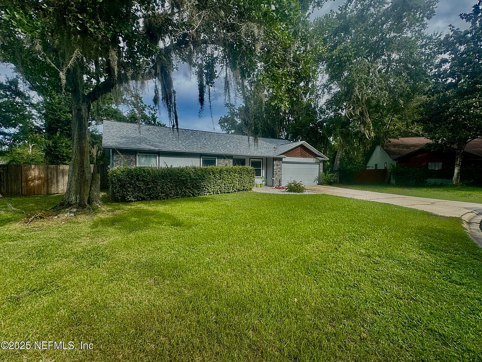 Beautiful home is located the heart of Fleming Island. This 3-bedroom, 2-bathroom home sits on a large lot, offering ample space for children and pets to play. It features a storage shed in the rear and a screened-in back patio. The interior boasts LVP flooring throughout, along with a fresh coat of paint inside and out. Additionally, it comes with a new roof and a new AC unit.