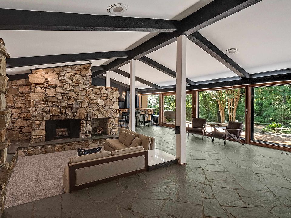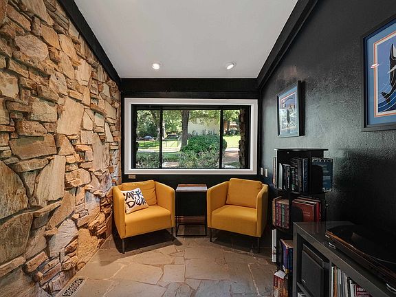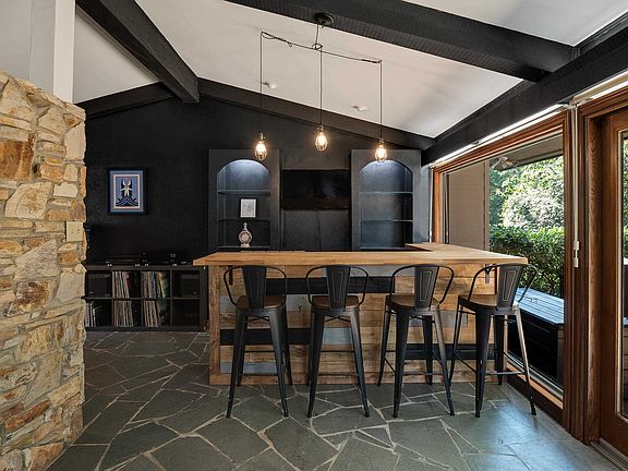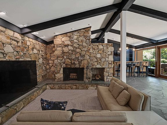 Pure Mid-Century on large lot w/ many custom finishes and features. Designed to maximize indoor/outdoor living. Walls of glass look into private rear gardens. Decks and patios too. Open, flowing spaces to use as you choose. Enjoy a wood fire (w/ gas line) in the cosy sunken sitting area. Plus bar area w/ quiet nook. Seller has replaced the appliances. 3 or 4 bedrooms with 3 1/2 baths. Exercise room or den can be playroom or office. Ample grassy side yard for play. Move-in and enjoy! It's ready!