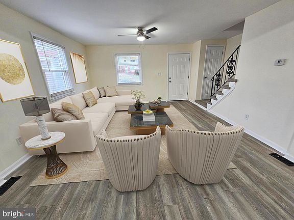 Recently updated Baltimore county end unit townhouse, with 5 bedrooms and 2.5 baths- 3BRs upstairs, 2BRs 1 BA in the basement with walkout. Featuring updated kitchen and modern appliances (sold as is) and a large wrap around, covered deck, great for entertaining. Bright, open kitchen/living room combination. Large rear yard. Rarely available parking pad on side of house. A great buy with lots of rooms. We had virtual staging to show how to setup first floor furniture.