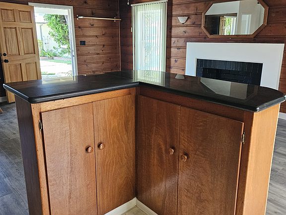 Faux fireplaceL shaped bar islandLaundry hook-ups on patioOpen beam ceilingNew appliancesGranite countersVertical blinds