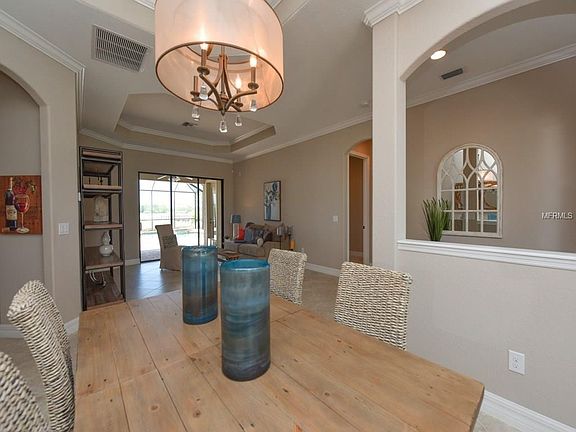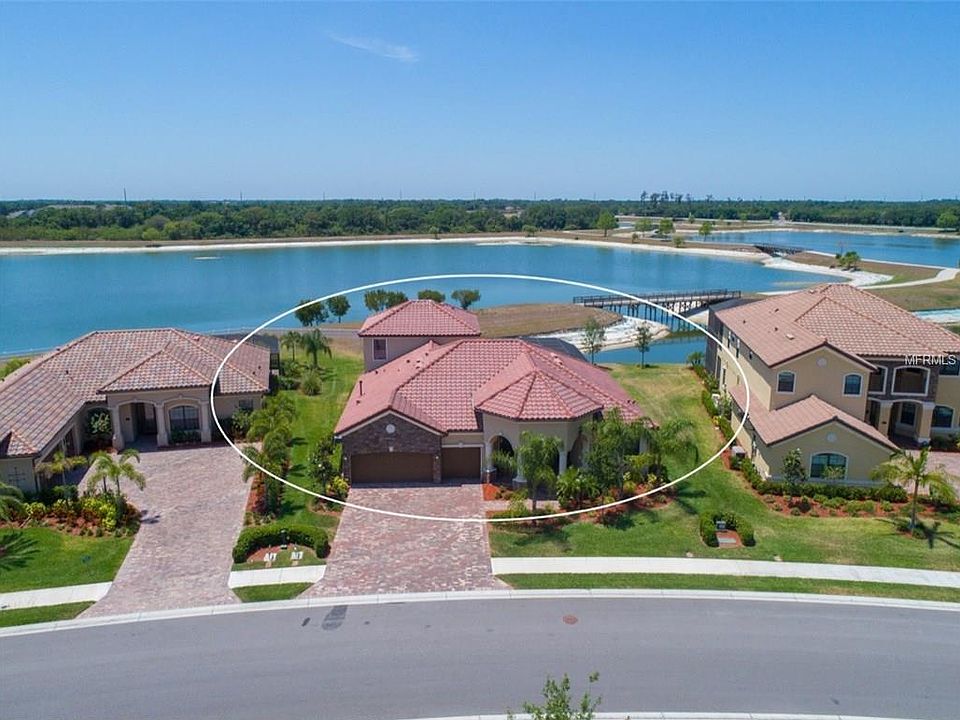 Wake up every morning to serene lake views from this majestic five-bedroom home in the new Bridgewater community at Lakewood Ranch. Built in 2015, this rarely available, Georgetown Grande II floor plan brims with style and sophistication in a setting beyond compare. Making for a picturesque backdrop, you'll never tire of the 180-degree water vista with two charming walking bridges beyond. Enter through the gracious front porch into the welcoming living room overlooking the pool and lake beyond. From the formal dining room, impeccable trim, molding, and tray ceilings infuse special occasions with an extra touch of class. The kitchen is an impressive centerpiece with granite counters, stainless steel appliances, and tile backsplash. The scene is all set for comfort and enjoyment from the open great room where large sliders pull back to bring the outdoors in. Relax in your own Floridian playground with resort-style pool, tranquil spa and built-in summer grill and bar. A three-car garage completes the picture. From this gated community, lawn care is included and it's the perfect segue to experience the ease of Lakewood Ranch with its many amenities including golf, tennis, trails, parks, restaurants, events, UTC Mall, and all the Gulf Coast offers.
