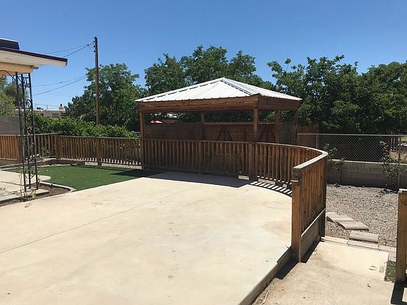 Roberson built home nestled in established neighborhood. Large backyard with turf, extended covered & open patio, gazebo, grape vines & storage along with a Drive-Thru 2-Car Garage to the backyard for extra parking or workshop area with an attached storage shed. Vivint Solar Panels on roof. Laminate & Tile Flooring throughout. Kitchen with bright, sunny window over the sink, breakfast bar, electric range with separate oven and refrigerator stays. Two living areas, wood burning fireplace, custom lighting & ceiling fans. Master with large walk-in closet & bath with jetted tub/shower. Hall bath has updated shower done by DreamStyle Remodeling. Laundry room with storage and washer & dryer stay.