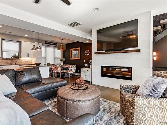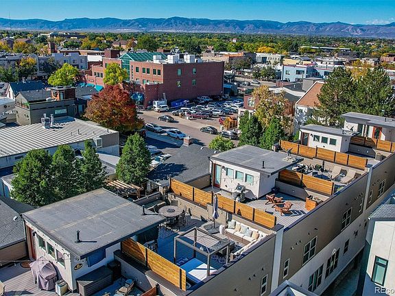 Luxury Modern Living just steps from the Downtown area of Historic Littleton! This truly beautiful, fully upgraded townhome has so much to offer! The main floor has gorgeous hardwood throughout, a cozy fireplace in the family room that flows into the gourmet kitchen. The kitchen has quartz counters, stainless appliances, shaker cabinets and an island. There is a balcony off the family room and a conveniently located half bath. The floating staircase leads to the upper level with 2 large bedrooms each with an en-suite bathroom. The primary bedroom has a large walk-in closet. The third level has a full roof-top deck with expansive views, a gas line and wet bar, it is truly an entertainers dream! Garage has substantial remote control shelving that provides great and convenient storage! One block away is restaurants, spas, yoga studio, shopping, coffee bars and breweries, downtown Littleton has so much to offer. The light rail station is 2 blocks away and there are parks within walking distance too, this location is so ideal. Chatfield reservoir and downtown Denver are just a short distance away. Looking for an investment? An identical unit in the building is renting for just under $4000/month, all the furniture is negotiable as well! You will not want to miss this property, it is a rare find with a full roof-top deck in this location!